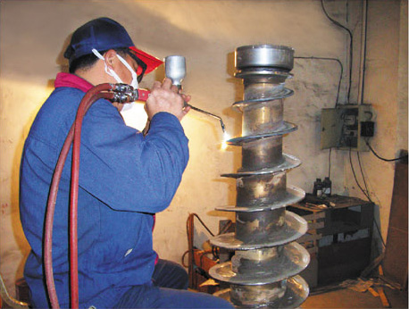 6、關鍵部位防腐、耐磨。螺旋推料麵、螺旋體進料分(fèn)布部位及轉鼓(gǔ)出(chū)渣口等關鍵部(bù)位一般均噴焊或堆(duī)焊硬質(zhì)合金耐磨層,特殊用途離心機則 采用鑲片式(shì)硬質合金耐磨塊或鑲(xiāng)耐(nài)磨套或貼耐磨陶瓷片(piàn),防(fáng)腐、耐磨、使用壽命長。